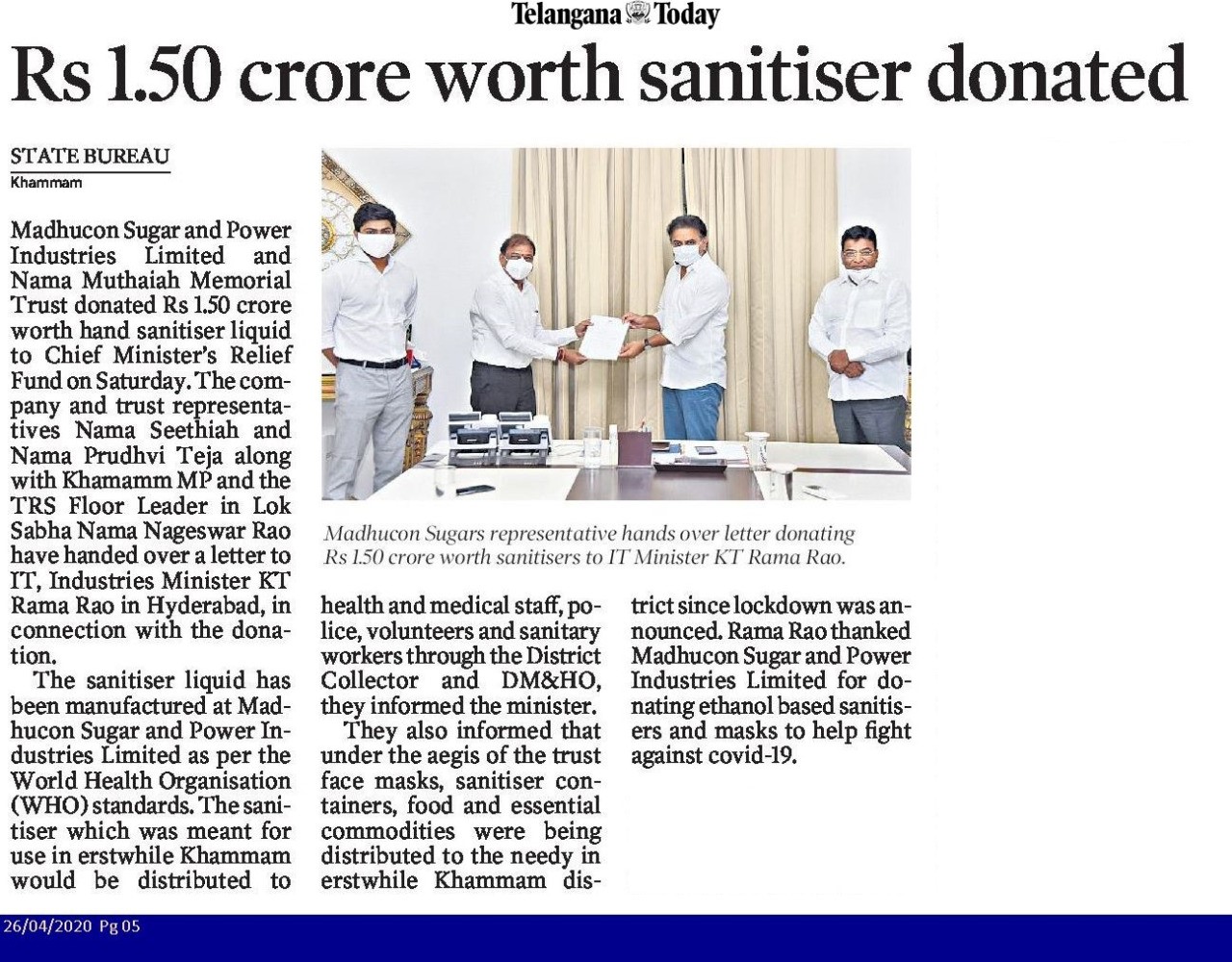 - Donation of Sanitizer Liquid, containers, face masks to fight against Covid-19 and other essential commodities total worth Rs 1.50 Crore by Nama Muthaiah Memorial Trust to needy in erstwhile Khammam District during lockdown.